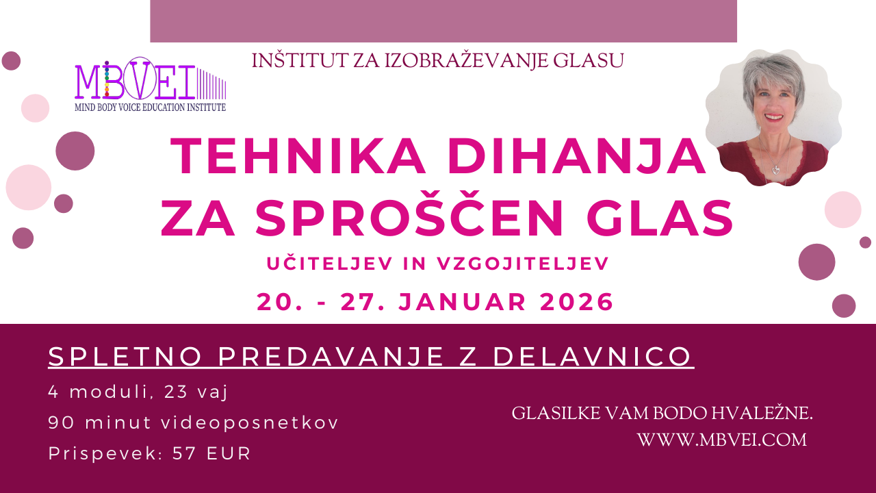 Raziskali boste svoj vzorec dihanja in se naučili globoko-rebrno trebušno dihanje, ki je nujno, za sproščeno delovanje glasu.
